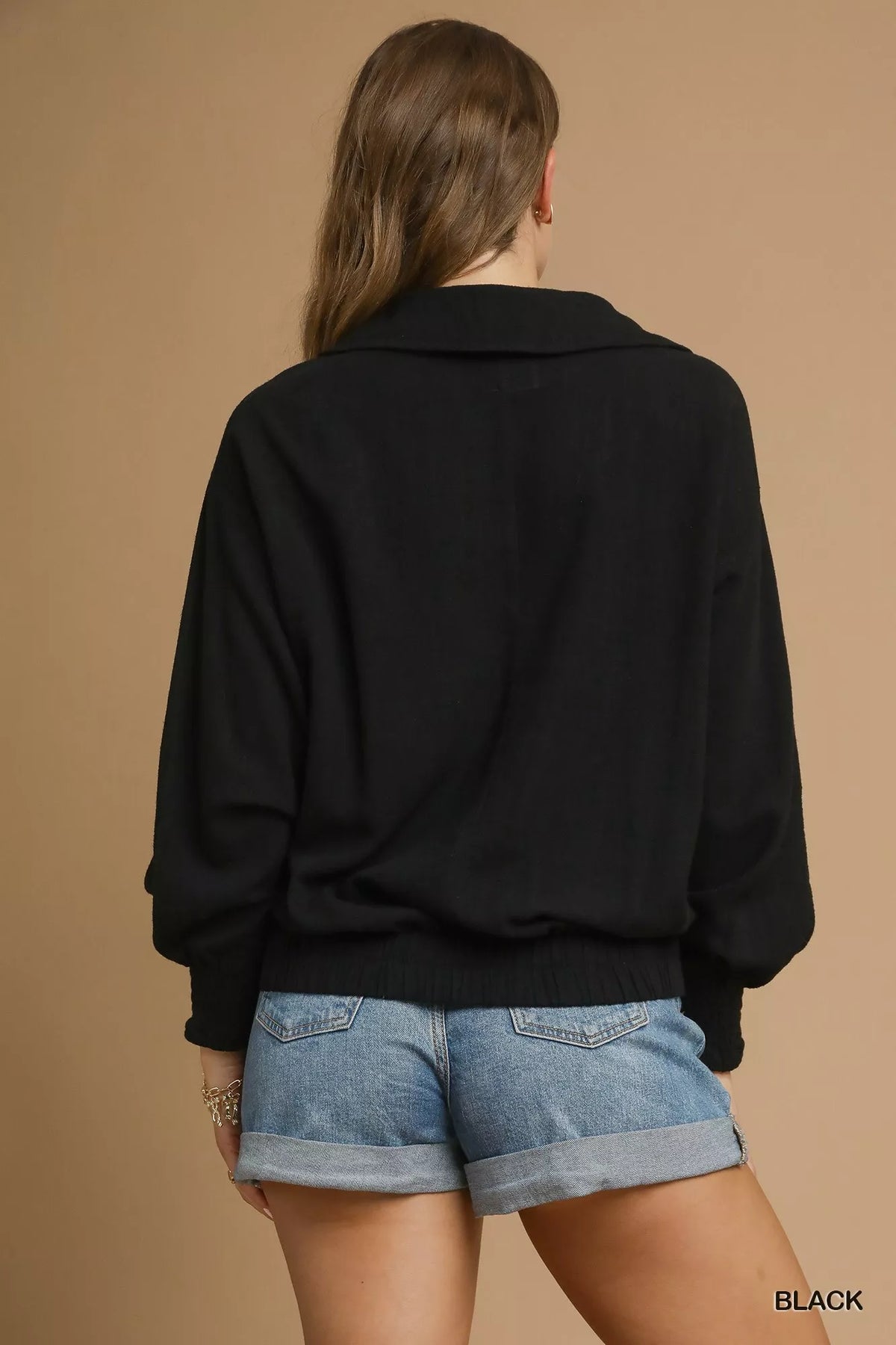 Inform when this item available Umgee Linen Long Sleeves Elastic Hem Blouse - Black