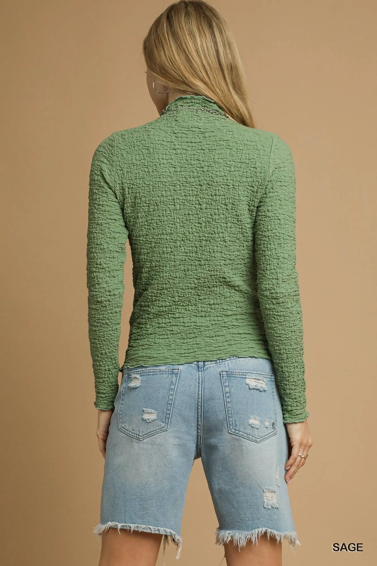 This textured crinkle knit long sleeve top is a stylish and versatile addition to your wardrobe. The textured fabric adds visual interest and dimension to the top, giving it a unique and trendy look. With long sleeves, it provides both warmth and coverage, making it ideal for layering during cooler weather. The crinkle knit material ensures a comfortable and flattering fit that drapes beautifully on the body. Elevate your everyday outfits with this chic and easy-to-wear top that can be dressed up or down effortlessly. Add this textured knit top to your collection for a versatile and fashion-forward option that you can rely on for various occasions.