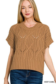 This stylish cable knit pullover sweater features an intricate textured pattern with short sleeves for versatile seasonal wear. Crafted from soft knit fabric in a warm camel tone, it offers a relaxed fit that's perfect for casual styling. The round neckline and cable knit detailing add sophisticated charm while maintaining comfort for all-day wear. Ideal for layering or standalone styling, this pullover combines classic knit craftsmanship with modern short-sleeve design.
