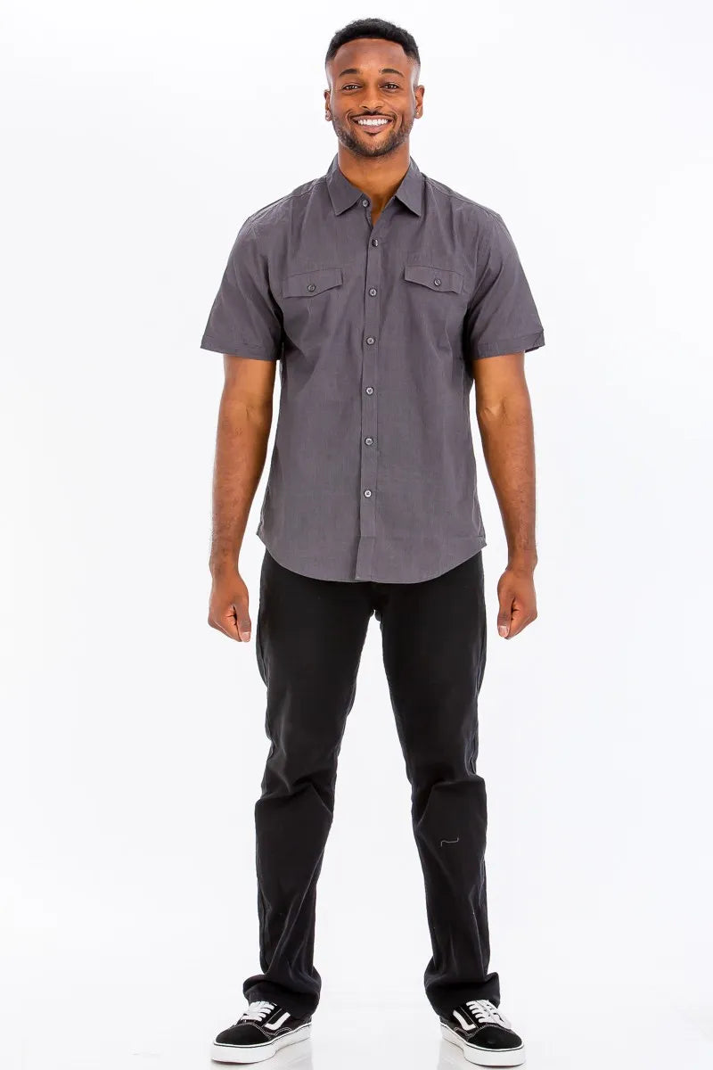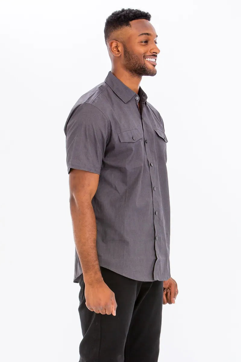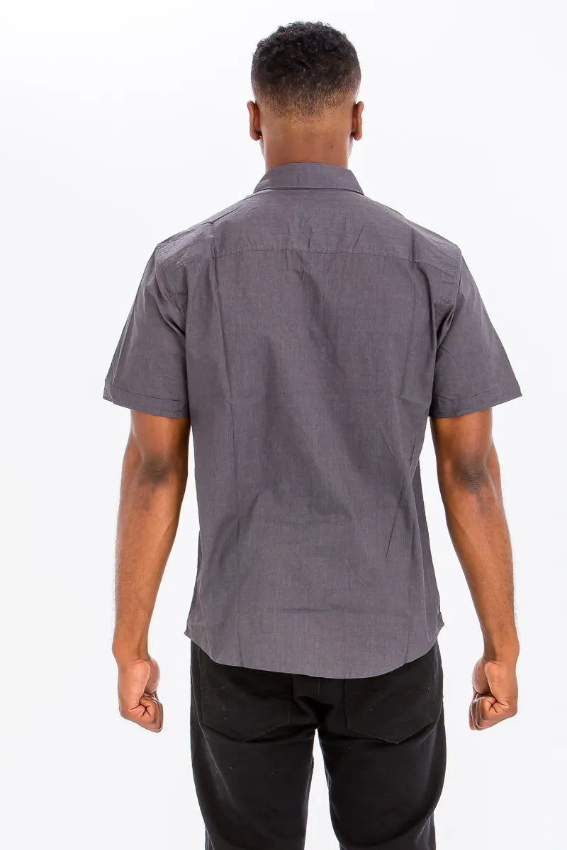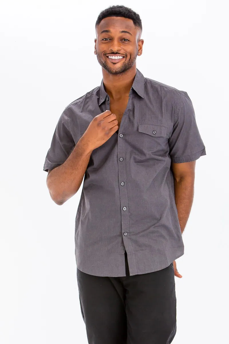 This classic men's short sleeve button-up shirt features a sophisticated color that pairs perfectly with any wardrobe. Made from premium cotton blend fabric that offers breathability and comfort throughout the day. The relaxed fit design ensures freedom of movement while maintaining a polished appearance. Features include a functional chest pocket, traditional collar, and durable button closure. Perfect for casual outings, office wear, or weekend activities. The versatile gray tone makes it easy to match with jeans, chinos, or dress pants. Quality construction ensures long-lasting wear and easy care maintenance.